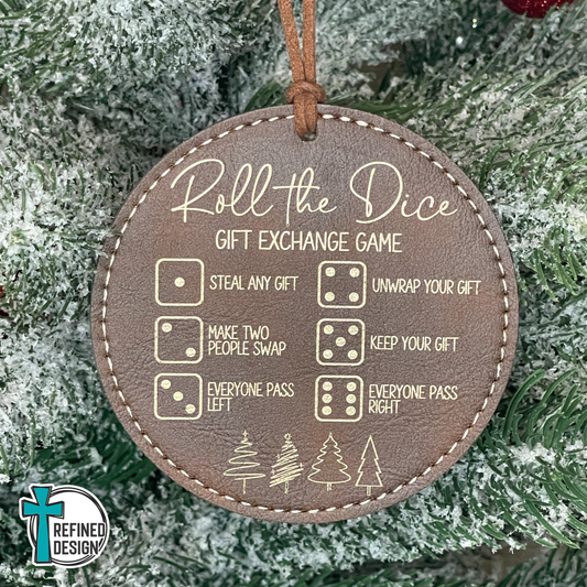 Light Brown Leatherette (Black Engraving) Roll the Dice Gift Exchange Game Ornament with Wooden Dice
