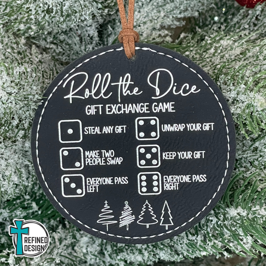 Black Leatherette (Silver Engraving) Roll the Dice Gift Exchange Game Ornament with Wooden Dice