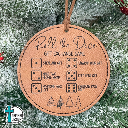 Light Brown Leatherette (Black Engraving) Roll the Dice Gift Exchange Game Ornament with Wooden Dice