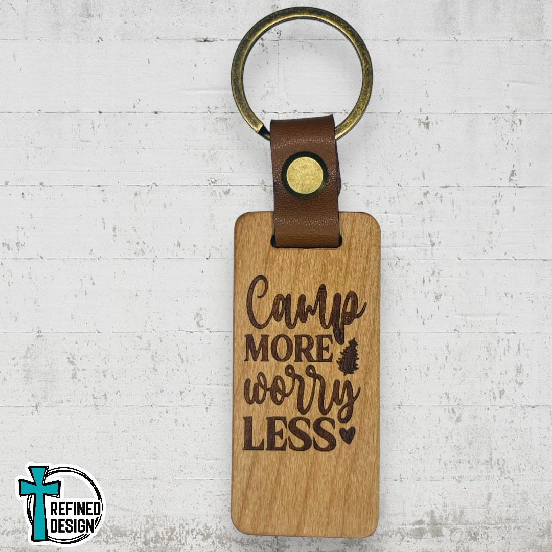 The design is laser engraved on this smooth wooden rectangular keychain. Wooden rectangle is 2.6 x 1.1 inches and 0.14 inch thick. The keyring is metal attached by a leather strap. Total length of keychain with the ring is about 4.3 inches.