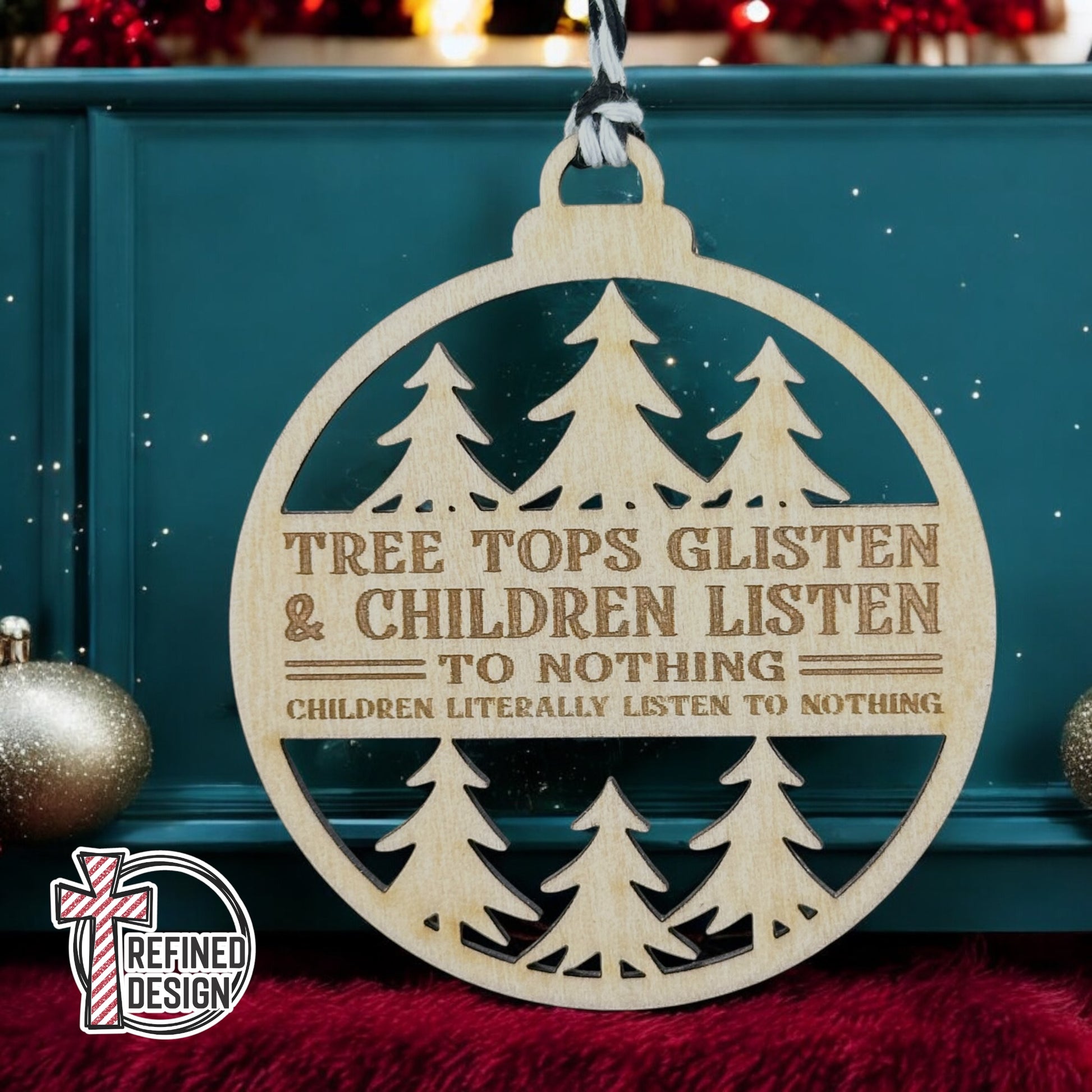Add a dose of holiday humor to your tree with this playful wooden ornament. Featuring a festive forest design paired with the witty phrase, “Tree Tops Glisten & Children Listen to Nothing—Children Literally Listen to Nothing,” this piece is perfect for parents who can relate to the chaos of the season.