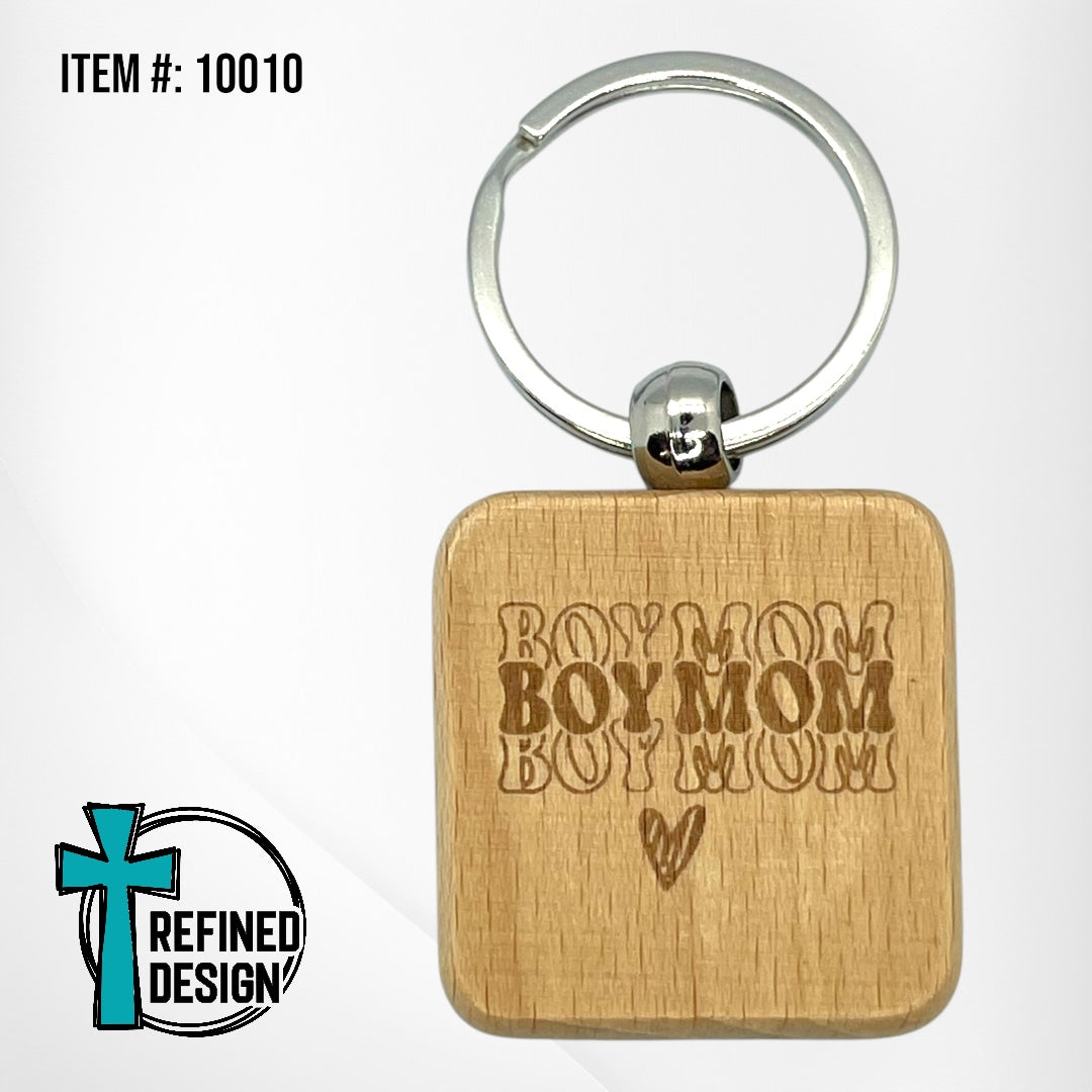Design is laser engraved on this smooth wooden square keychain. Wooden disk is 1.57 x 1.57 inches and 0.7 cm / 0.28 inch / 7 mm thick. The key ring is a sturdy stainless steel.