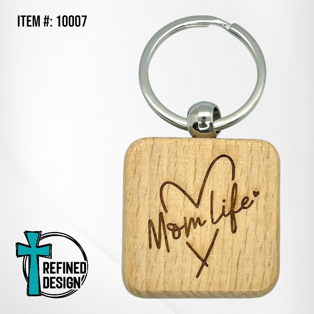 Design is laser engraved on this smooth wooden square keychain. Wooden disk is 1.57 x 1.57 inches and 0.7 cm / 0.28 inch / 7 mm thick. The key ring is a sturdy stainless steel.