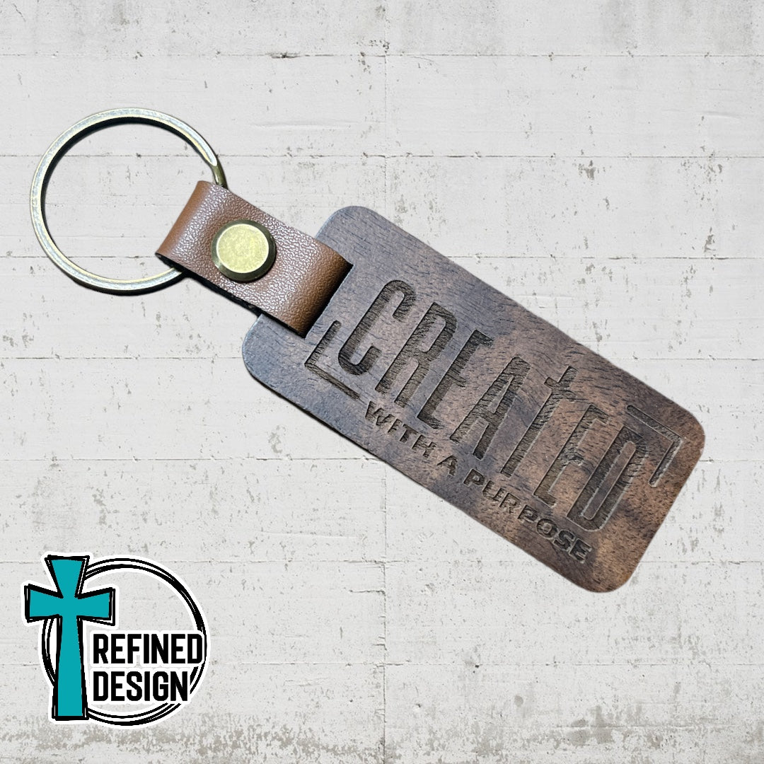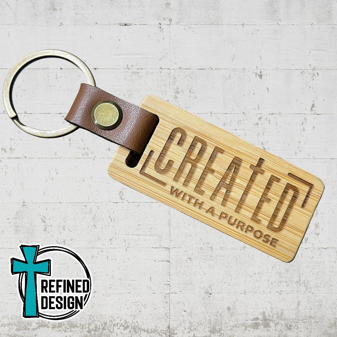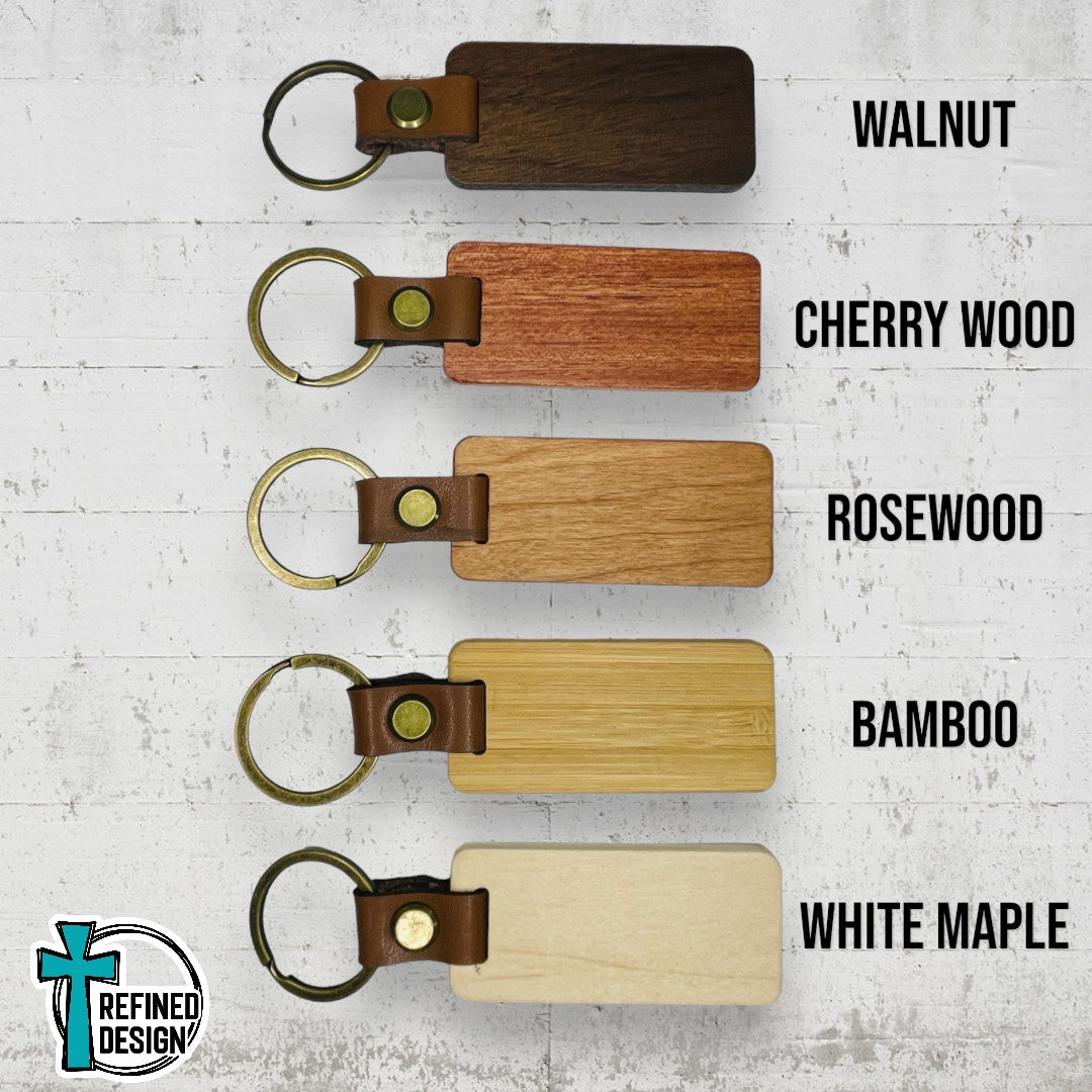 The design is laser engraved on this smooth wooden rectangular keychain. Wooden rectangle is 2.6 x 1.1 inches and 0.14 inch thick. The keyring is metal attached by a leather strap. Total length of keychain with the ring is about 4.3 inches.