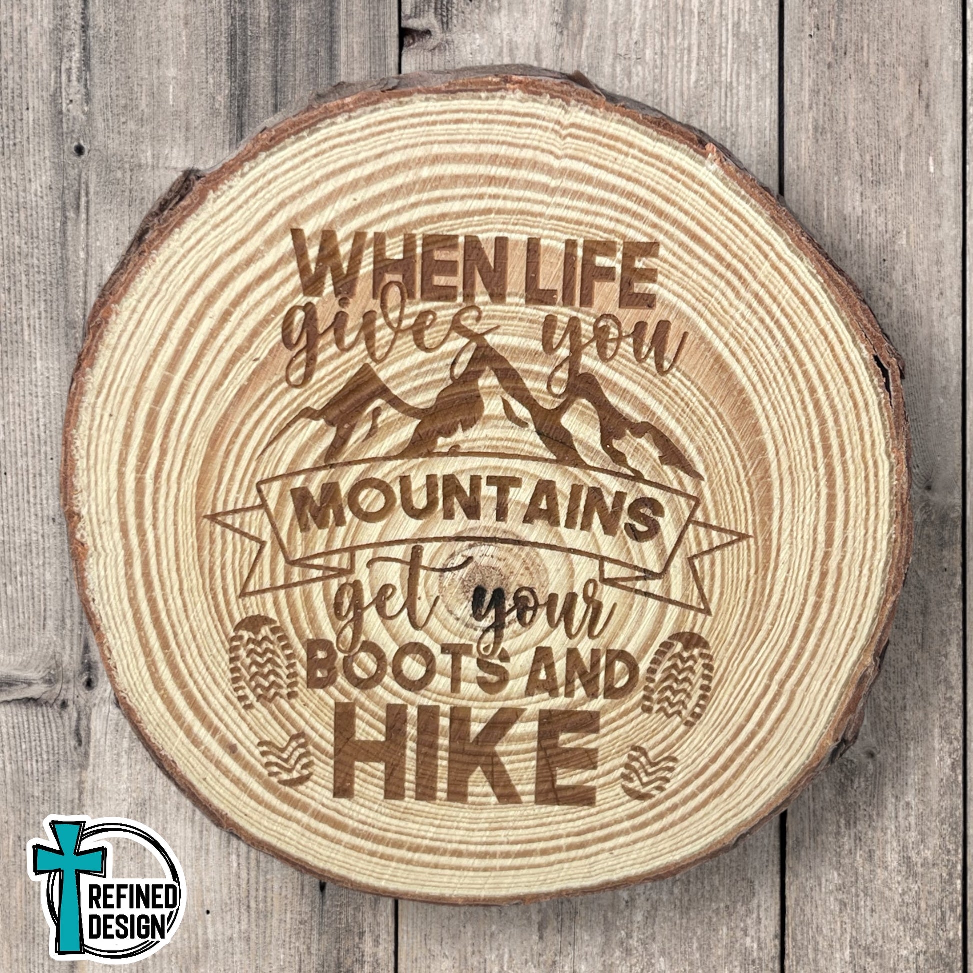 Natural pine wood slice, approximately 4” in diameter and 0.4” thick.