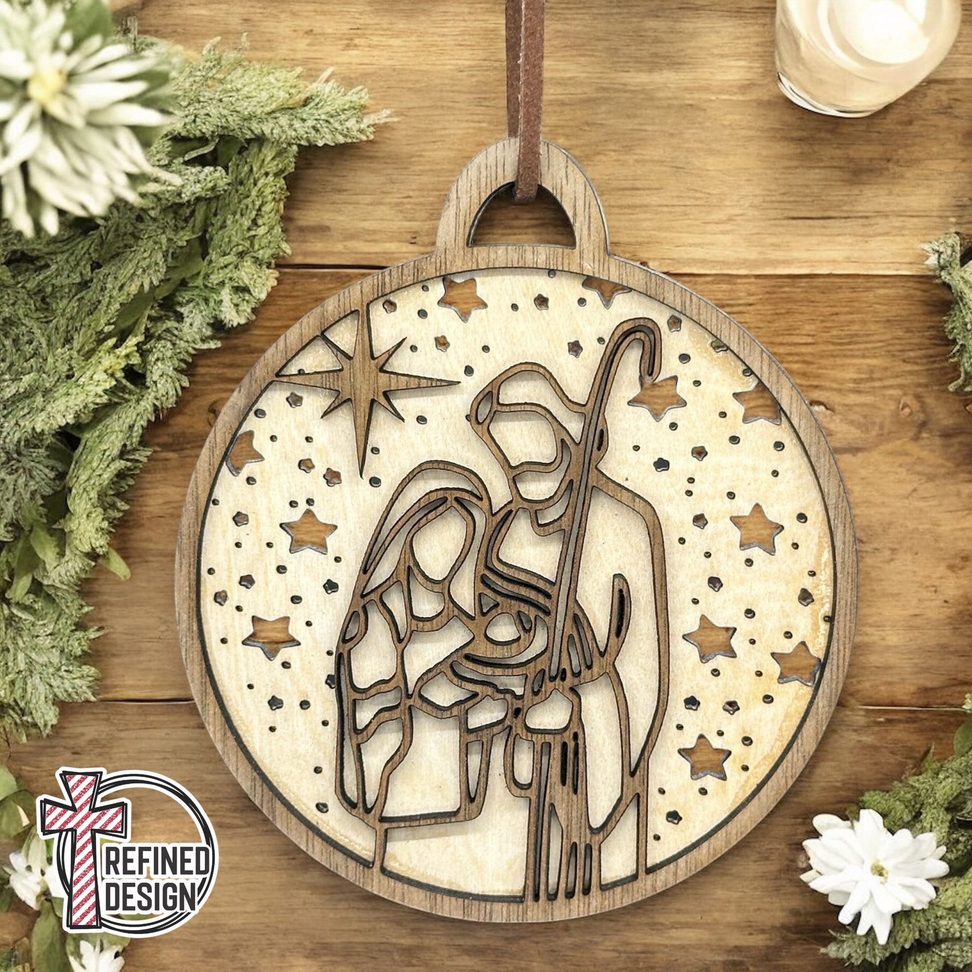 This is a beautifully crafted Nativity-themed wooden ornament featuring a laser-cut design of Mary, Joseph, and baby Jesus under the guiding star. The intricate detailing highlights the holy family surrounded by stars, symbolizing peace and the spirit of Christmas. Made from layered Baltic Birch and Walnut wood, this ornament has a rustic charm and comes with a leather strap for easy hanging. Perfect for adding a meaningful touch to your holiday decor or as a thoughtful gift for loved ones during the Christmas season.