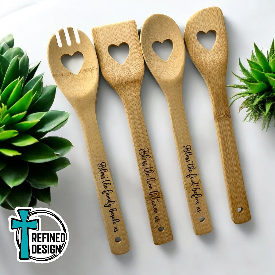 Add a heartfelt touch to the kitchen with this beautifully crafted 4-piece bamboo utensil set, featuring a sweetheart cutout and inspirational engraved messages. Each utensil is laser engraved with faith-filled phrases like: