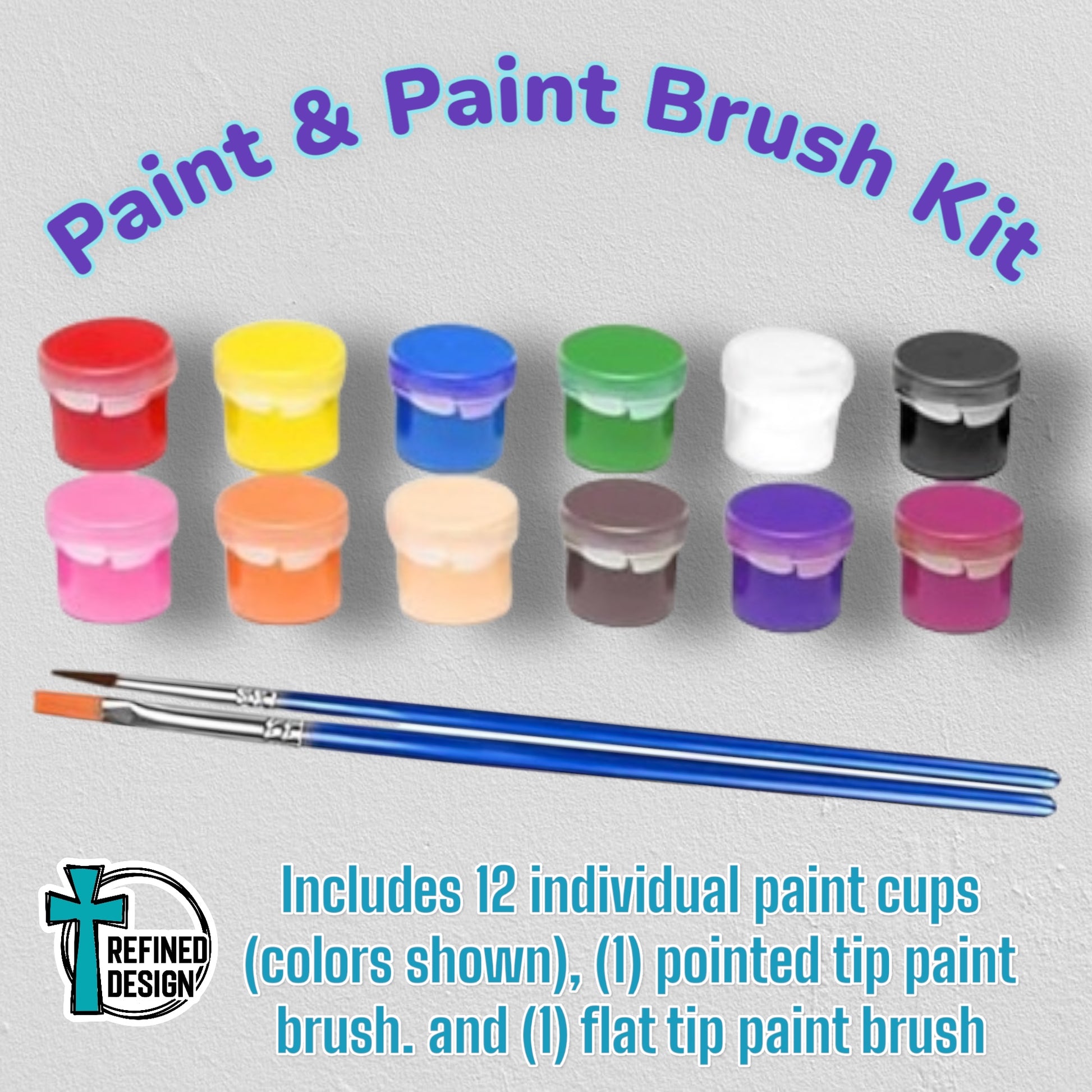 Includes 12 individual paint cups (colors shown), (1) pointed tip paint brush, and (1) flat tip paint brush.