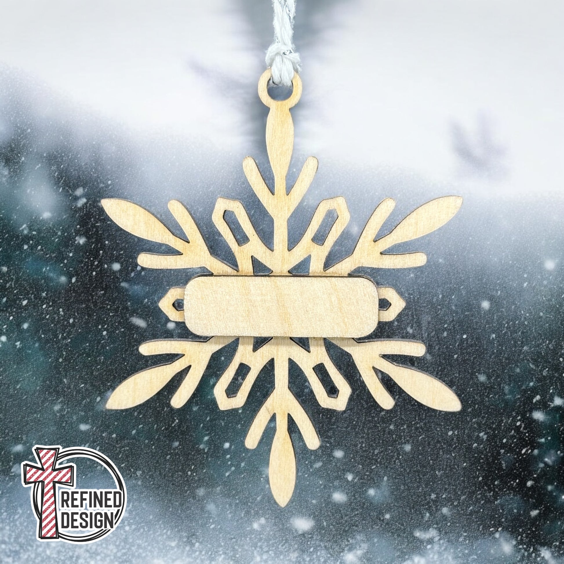 Add a touch of winter elegance to your holiday décor with this intricately designed wooden snowflake ornament. Featuring a symmetrical snowflake pattern with a customizable blank centerpiece, it’s perfect for personalizing with names, dates, or special messages.