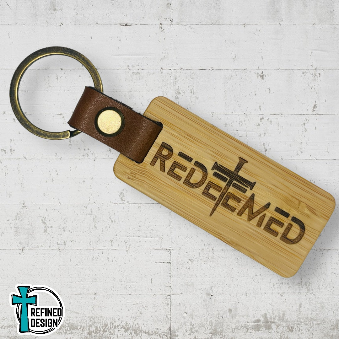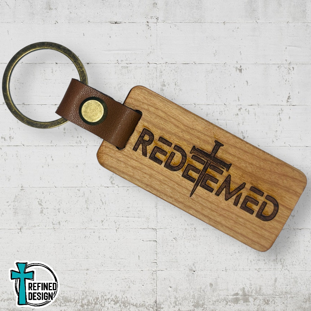 “Redeemed Nail Cross” Wood and Leather Keychain