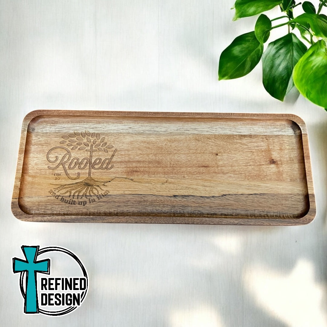 Serve with elegance and purpose using this beautiful acacia wood serving tray. Measuring 14” x 5.5”, the tray showcases the detailed design and scripture Colossians 2:7: “Rooted and built up in Him.”
