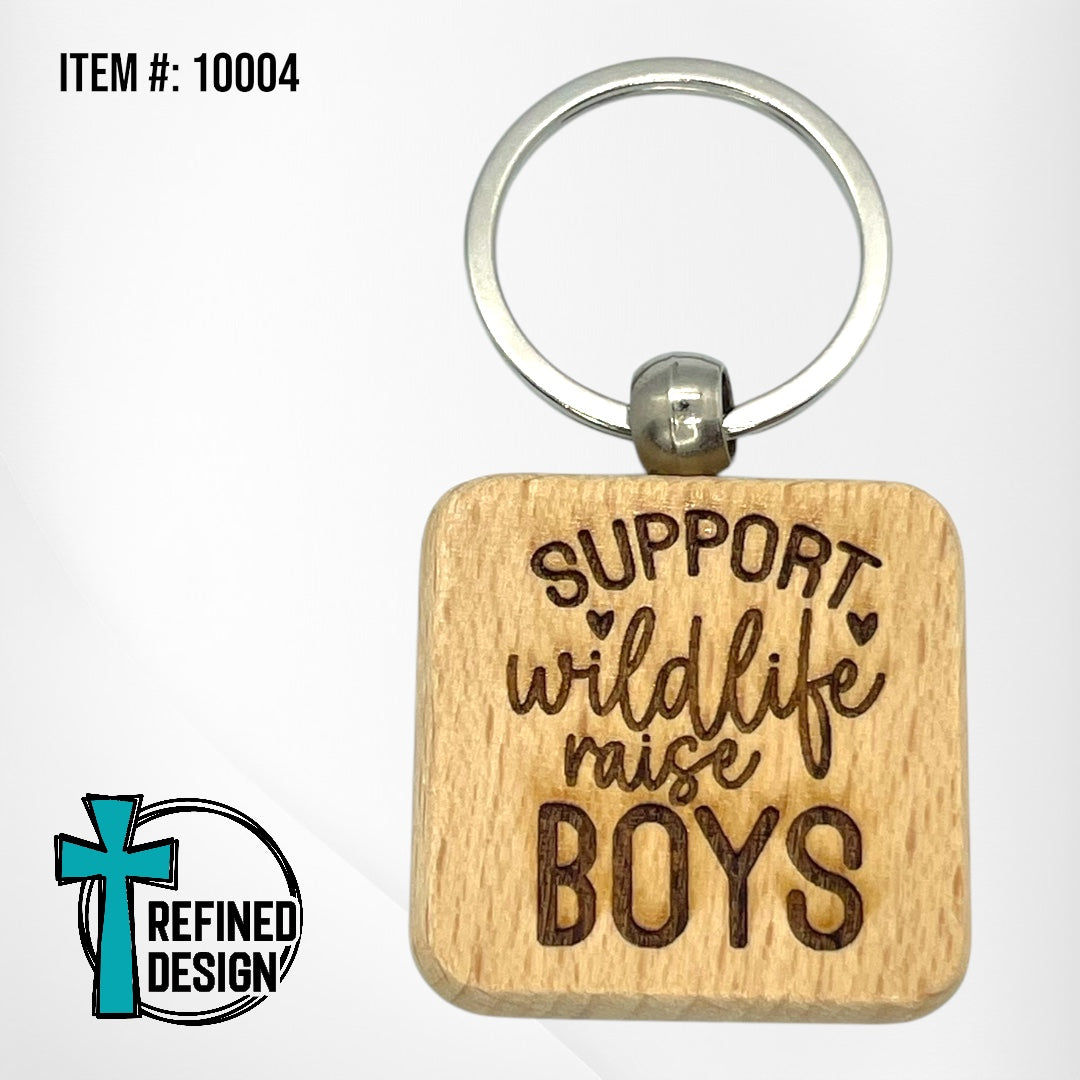 Design is laser engraved on this smooth wooden square keychain. Wooden disk is 1.57 x 1.57 inches and 0.7 cm / 0.28 inch / 7 mm thick. The key ring is a sturdy stainless steel.